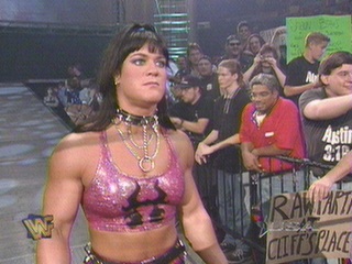 I've been a wrestling fan for the last two years or so, and got whipped into a frenzy by the whole Royal Rumble promo hype machine. Especially since Cactus Jack was going to be in it. But my experience with the cable company is another rant entirely; suffice it to say, Chuck Carlin (who occassionally writes "...Can Suck My Balls" for [slash]) and I didn't get to see it on Sunday night and we would like to make the incompent jackoffs at Charter Communications (who have an incredibly useless website at http://www.chartercom.com/gateway.asp) suck our collective balls. But he's ordering the replay and taping it for me, so I'll get to see it the next time I go back home. But this actually has nothing to do with the rest of this article, besides that my present excessive obsession with pro wrestling / sports enterainment is a lot of what prompted me to write this. My school has a January term, where we take a single class, graded pass/fail. I chose to take a Political Science class entitled The Politics of Gender-Bending. We talked about drag and transvestites and generally watched a lot of low-quality films. And we have to write a ten-page paper at the end about something related to the course topic. I chose to write about Chyna. Now while reading this, keep in mind that some of my facts might be off by a little due to my forgetting things, and I know I gloss over a lot of stuff, but I think I captured things fairly accurately. This paper is also intended to be read by a professor who hasn't watched pro wrestling since he was 15, so I try to stay as far outside of markdom and over-the-top smartdom as much as possible. Oh yeah, and I wrote it between 9 pm and 4 am over the course of a night. And that's it for my excuses for the bad parts. Feedback on this would be nice, but pretty useless at this point, as I've already turned in the paper. So without further ado, I present my Winter Study paper: I'd Rather Be In Chyna. In women bodybuilders, femininity and muscularity are often at odds with one another. In the world of professional wrestling, none symbolize this conflict more than the World Wrestling Federation's Chyna, played by Joanie Laurer. As a mass market entertainment form which must cater to an exceptionally large fan base, an examination of professional wrestling can provide insight into the general populace's views on the disparity between "tough" women and "feminine" ones. Laurer began her career as a professional bodybuilder under the name Joanie Lee. She was also a licensed boxer and trained in martial arts. Eventually, she left the bodybuilding circuit and entered into a pro wrestling training program, which resulted in her entrance into the World Wrestling Federation about a year and a half later. Unlike the rest of the female characters on this company's programs, Chyna is portrayed as something much better than a mere target for ogling and catcalling. Presented as legitimate competition for the male performers, she is scripted to score victories over many other male competitors, and during the last year, has become the first woman to hold the Intercontinental Title, the WWF's secondary championship. Costuming Although she has a strong frame - she's built like a male bodybuilder - effort has always been taken to costume the character Chyna in clothing which is undeniably female. Her usual ring attire consists of black pseudo-leather pieces which highlight her breasts, as well as either a thong under chaps or a bikini bottom. Usually, she wears sheer stockings, highlighting her legs. Silver chains and loops act to accessorize with this outfit; she is one of the very few professional wrestlers who wears such jewelry. This jewelry, along with the rest of her attire, helps to emphasize her feminine qualities, while the almost dominatrix-like style of dress maintains her credibility with the audience as a threatening being. Chyna, for much of her duration in the WWF, has been clothed in black leather outfits, often very similar to those worn by the character Xena on the television program Xena: Warrior Princess. By essentially copying the costuming of a "strong" female role who has already been accepted by the mainstream audience, Chyna is able to more easily pass as female. The audience is able to realize that this costume signifies strength with the presence of femininity as already defined by the Xena character. The unrealisticness of wrestling's costuming calls attention to its drag-like nature. Male wrestlers usually perform in spandex or bikini briefs, highlighting their muscle development, while women appear more often than not in two-piece bathing suits, strange bondage-like outfits, or simply in their underwear. Clearly, none of these are acceptable normal forms of dress, but the characters of wrestling appear in these at all times, without disbelief from the audience. Similar in nature to the competitors shown in the film Pumping Iron II: The Women, many professional wrestlers - both male and female - base their jobs on their ability to look good while performing their stunts, requiring skimpy, often ridiculous outfits. Surgery In Pumping Iron II: The Women, Bev Francis was criticized for being too muscular and for not appearing feminine enough for the competition's tastes. While competing as a bodybuilder and during her early involvement with the World Wrestling Federation, Laurer had a similarly masculine appearance. Her jaw and chin were large and prominent, and her breasts and hips were muscled to the point of appearing male. At first, it was hoped that her femininity could be emphasized merely through hairstyle and dress; however, this didn't seem to be enough, as she was still thought of - both by the audience and the promotion itself - as too manly. As an example of this, a commercial aired to hype a "swimsuit contest" between characters ran with an announcer's voiceover paraphrased as follows. Unfortunately, this section is from a description of a WWF commercial sh